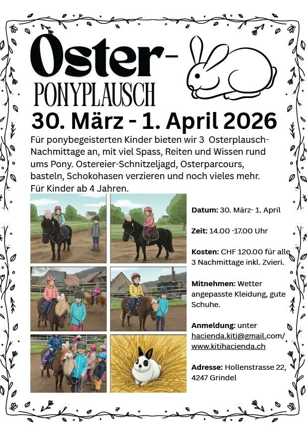 30. März - 1. April, 3 Tage Osterplausch 1 freier Platz für alle 3 Tage und 1 freier Platz am 01.04. Kosten: CHF 120.00 für alle 3 Tage + CHF 40.00 für 1 Nachmittag inkl. Zvieri.