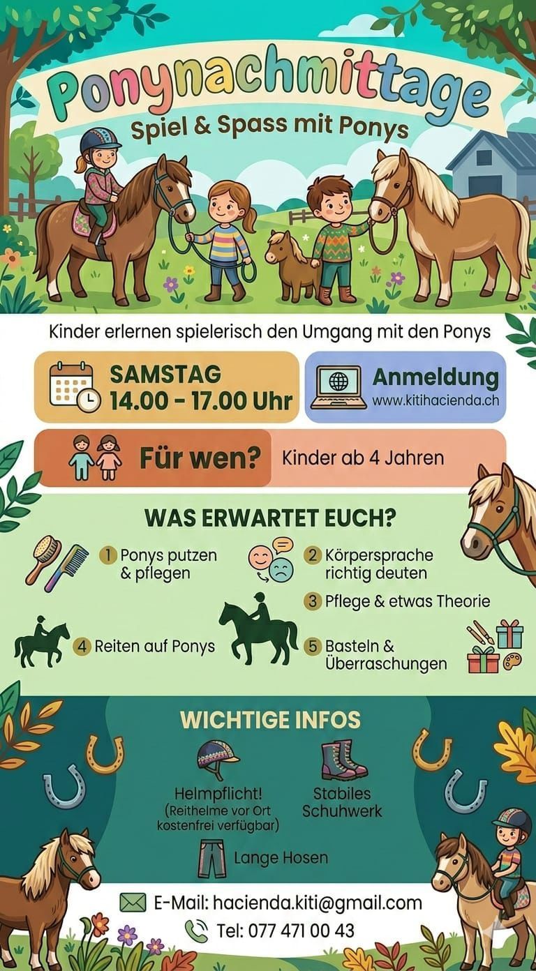Der Ponynachmittag richtet sich an Kinder ab 4 Jahren und findet in Gruppen bis zu 12 Kindern statt. Gemeinsam lernen wir die Ponys zu putzen, das Halfter anzulegen, zu führen und zu reiten. Die Kinder erfahren die Körpersprache des Ponys und wie man sicher mit ihm umgeht. Auch Pflege, kleine Theorie-Einheiten und Basteln oder spezielle Aktivitäten mit den Ponys gehören dazu. Das Programm wird je nach Wetter drinnen oder draußen angepasst.